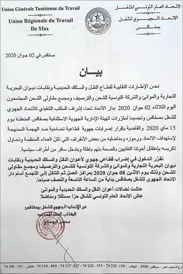أعلن الاتحاد الجهوي للشغل بصفاقس، الدخول في إضراب قطاعي جهوي لأعوان النقل والسكك الحديدية ونقابات ديوان البحرية التجارية والموانئ والشركة التونسية للشحن والترصيف ومجمع مقاولي الشحن وذلك يوم 8 جوان 2020.